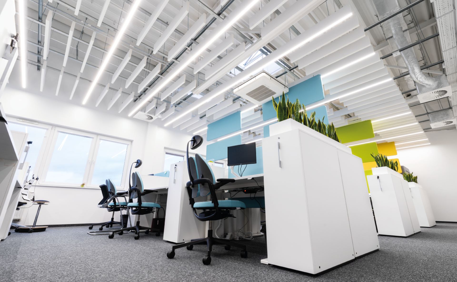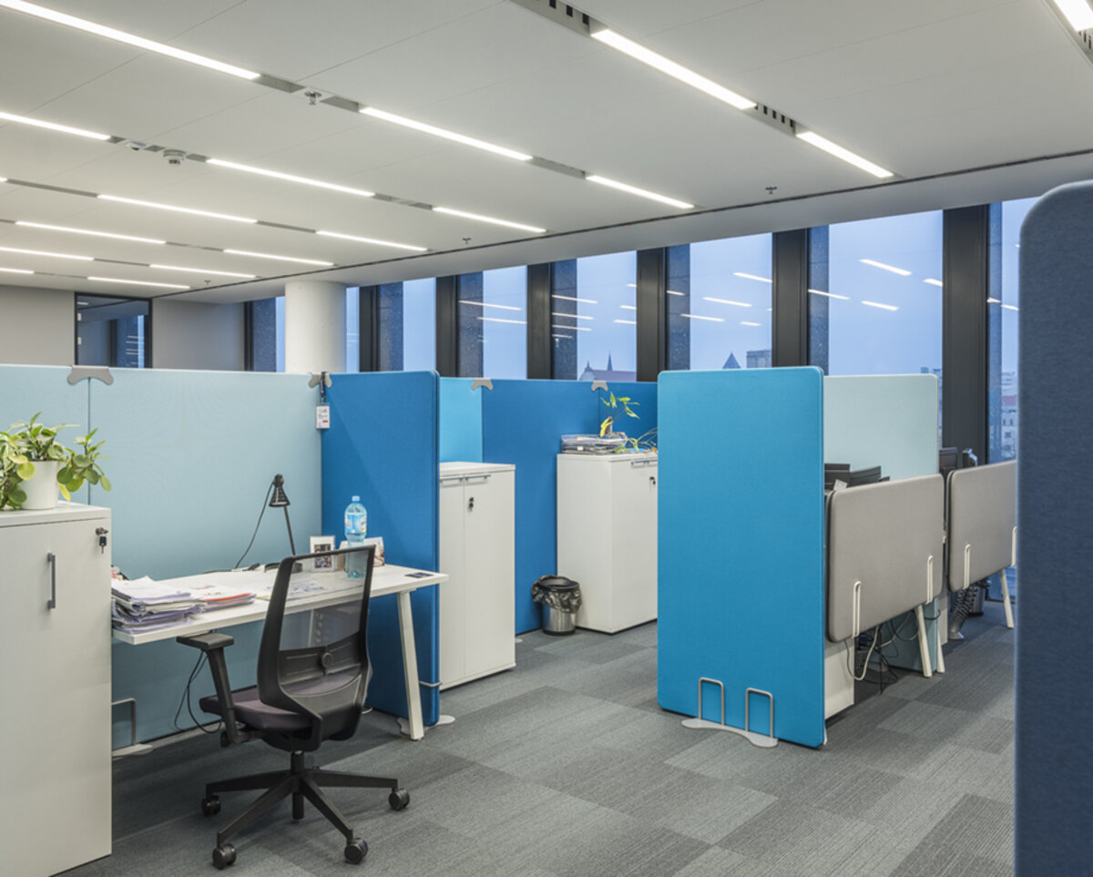 Geeignete LED-Beleuchtung sorgt für gleichmäßiges Licht, das die Konzentration und den Arbeitskomfort großer Teams unterstützt.